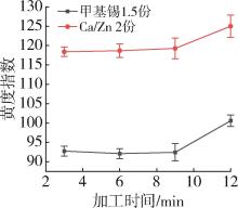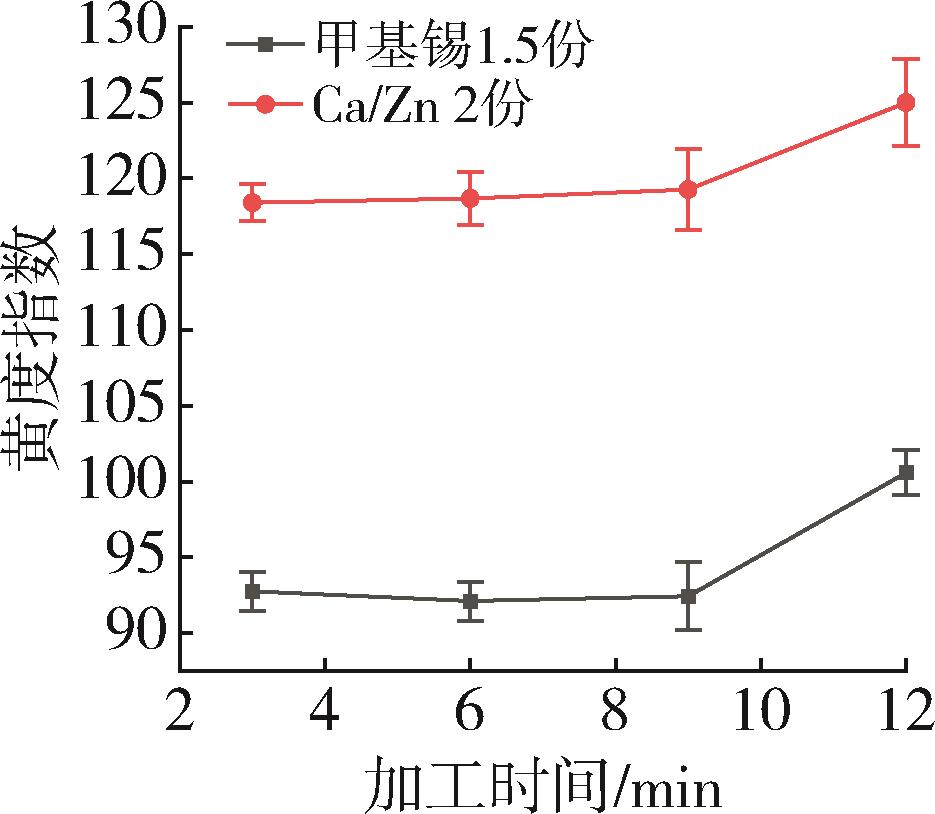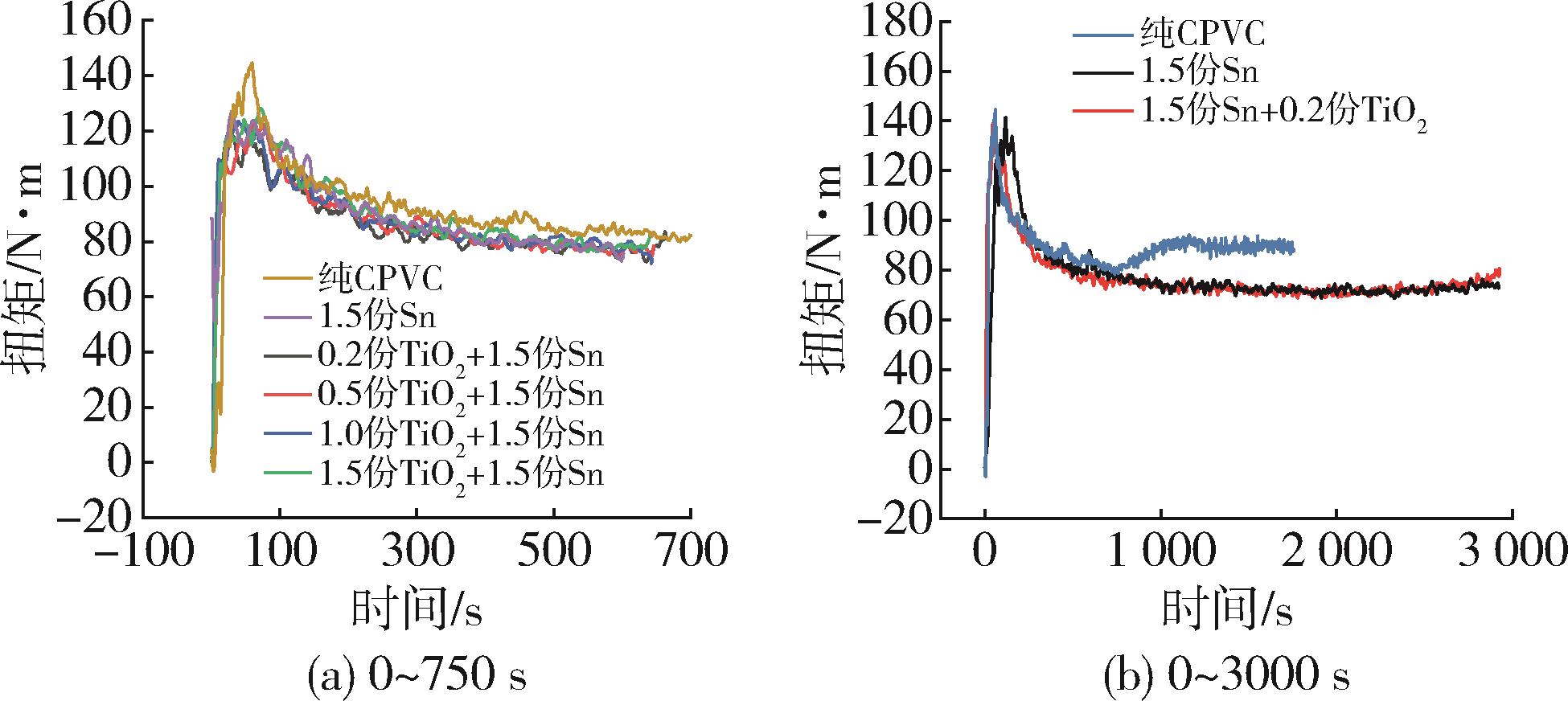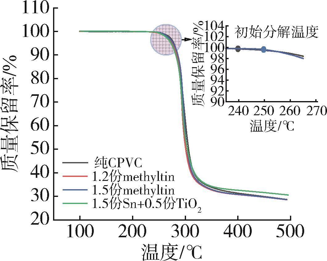 Chlorinated polyvinyl chloride (CPVC) suffers from a narrow processing window and poor thermal stability. To address these limitations, this study first established suitable processing conditions based on CPVC's structural characteristics and pyrolysis mechanism, providing a foundation for subsequent compounding modification. The effects of Ca/Zn metal soap, methyl⁃tin, and TiO₂ on the thermal stability, plasticization behavior, and thermal decomposition of CPVC were then investigated. Torque rheology and plasticization analysis determined the optimal processing parameters for TiO₂⁃filled CPVC to be a temperature of 145 ℃, a shear rate of 45 r/min, and a processing time of 10 minutes, with TiO₂ found to promote rapid plasticization. Based on yellowness index and thermogravimetric⁃infrared analysis, methyl⁃tin significantly improved thermal stability, increasing the initial pyrolysis temperature from 240 to 250 ℃. Furthermore, torque rheological curves revealed that the thermal decomposition of pristine CPVC commenced at approximately 810 s, a process that was substantially delayed by the addition of methyl⁃tin. The results demonstrated that methyl⁃tin was a highly effective stabilizer for enhancing the long⁃term thermal stability of CPVC.