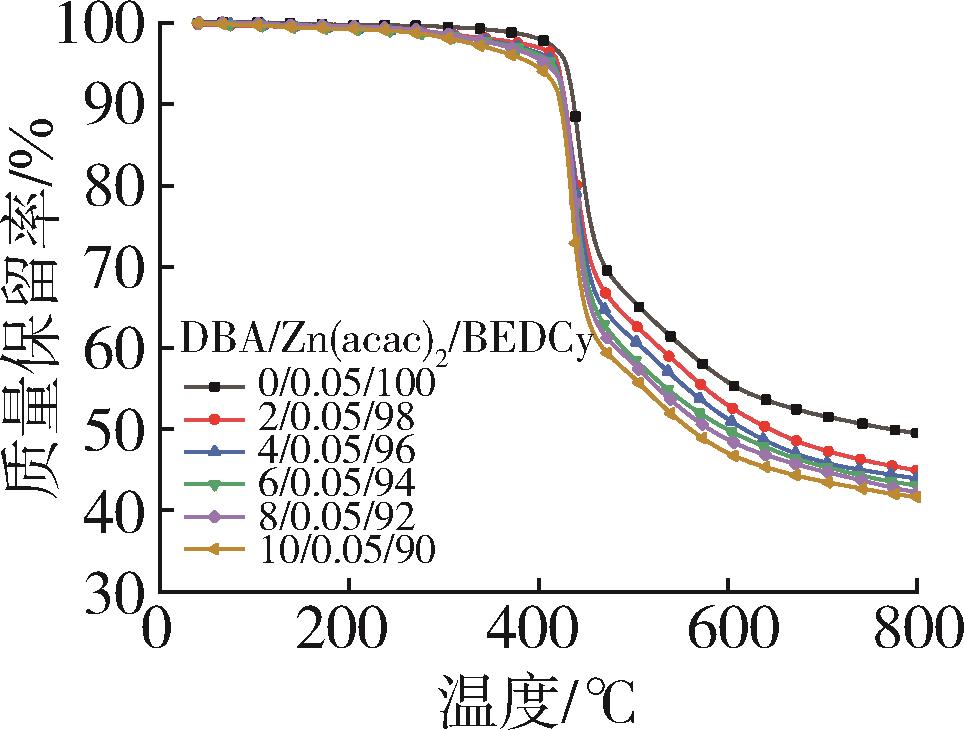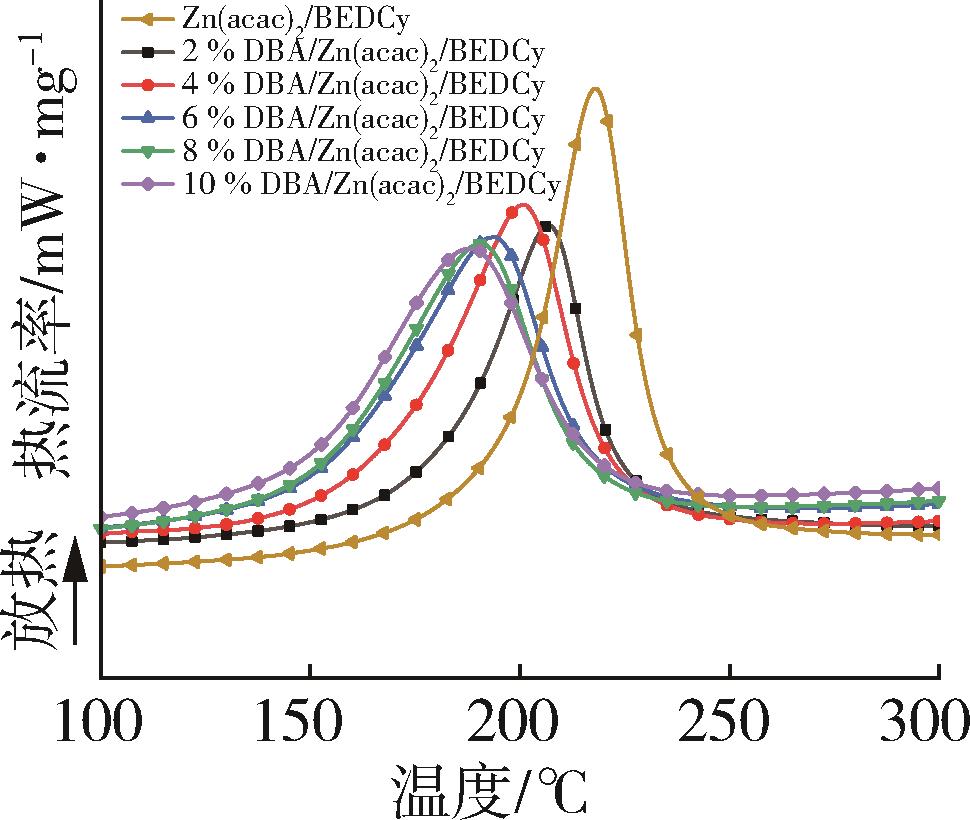 | 6 %DBA/Zn(acac)2/BECy | 413 | 426 | 436 | 43.08 |