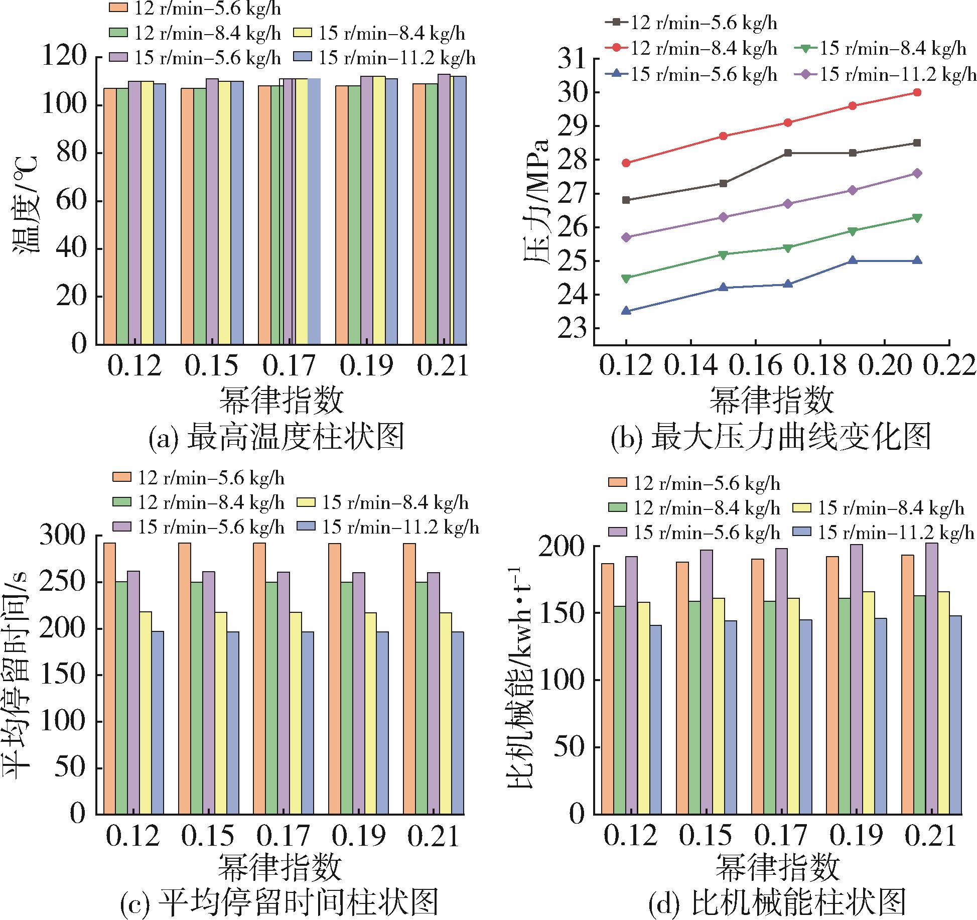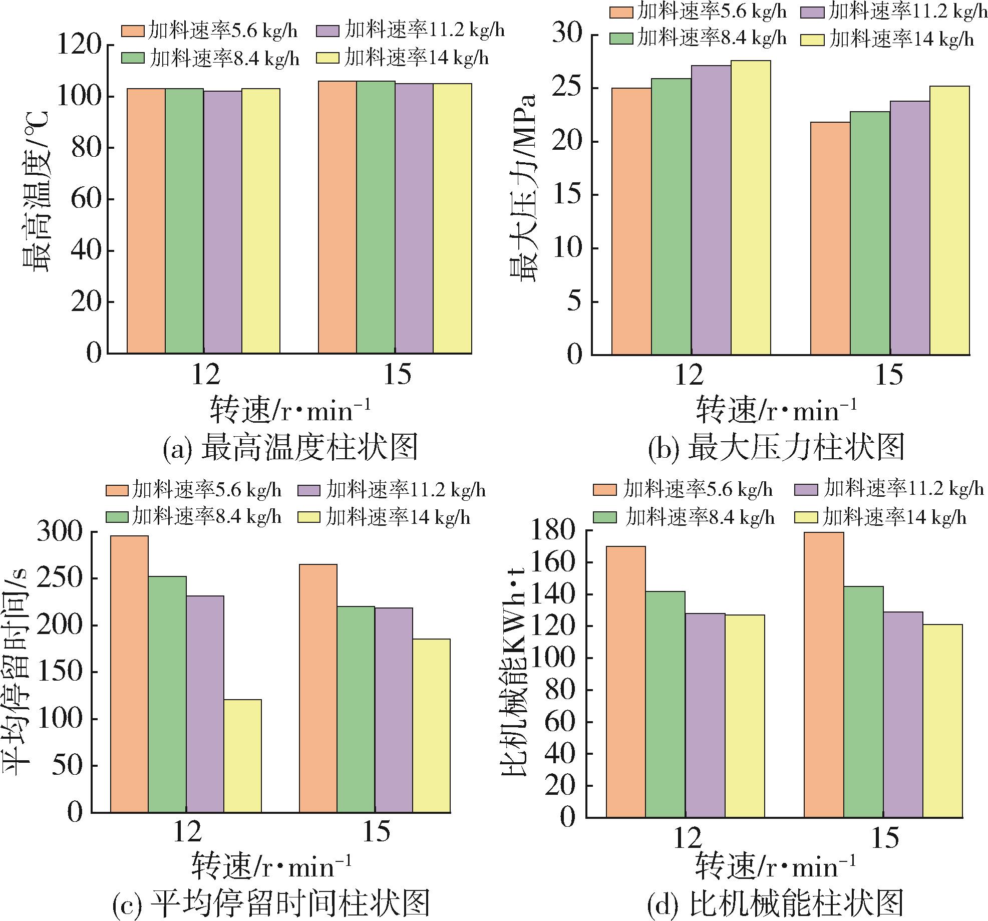 | 工艺温度 | 最高温度/ ℃ | 最大压力/ MPa | 平均停留时间/ s | 比机械能/ kWh·t-1 |